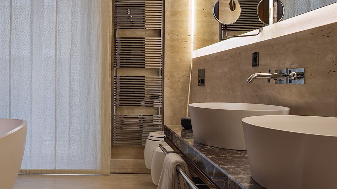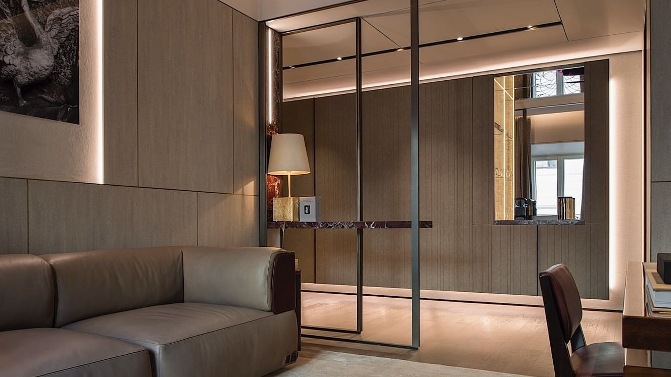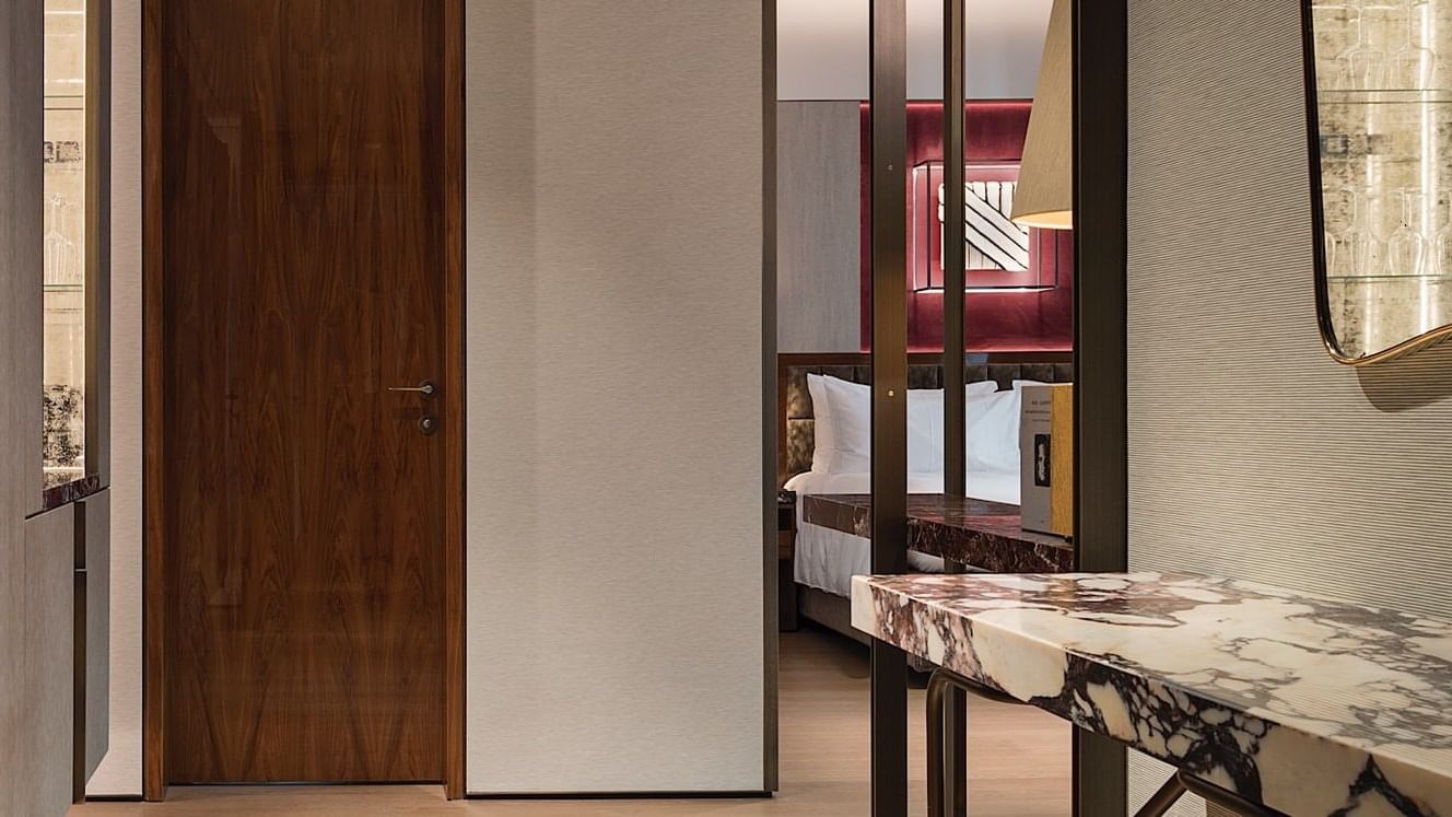 Deluxe Suite 5 is the best choice for those in search of privacy: a perfect oasis for romance, relaxation or concentration—but just a stone's throw away from Rome’s social life. The sleeping area and living area are discreetly divided by a glass panel, creating a spacious, modern space where guests can read, work or entertain as if in the comfort of their own home. The top-quality, all-Italian materials, meticulously detailed finishes and exclusive furnishings are in keeping with the carefully-selected wall art: original Karl Lagerfeld photographs that pay homage to Rome's fountains and the artisan Fendi archive masterpiece that adorns the headboard. The Carrara marble-decorated bathroom offers both a welcoming bath and a walk-through shower, as well as energizing Diptyque products and soft Fendi Casa bath linens.
